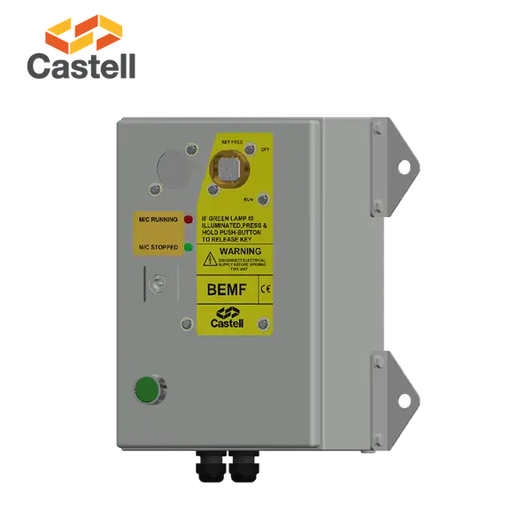 The BEMF Motor sensing Interlock is designed to control access to rotating machinery. The unit relies on the measurement of the electromotive force generated by the windings of an electric motor. Only when the motor has stopped will the BEMF drop to zero and allow the release of a Castell key. The unit is used for connection to AC and DC motors including DC braking systems. The BEMF has been designed to provide the highest level of safety when installed as part of an access control system for dangerous machinery.